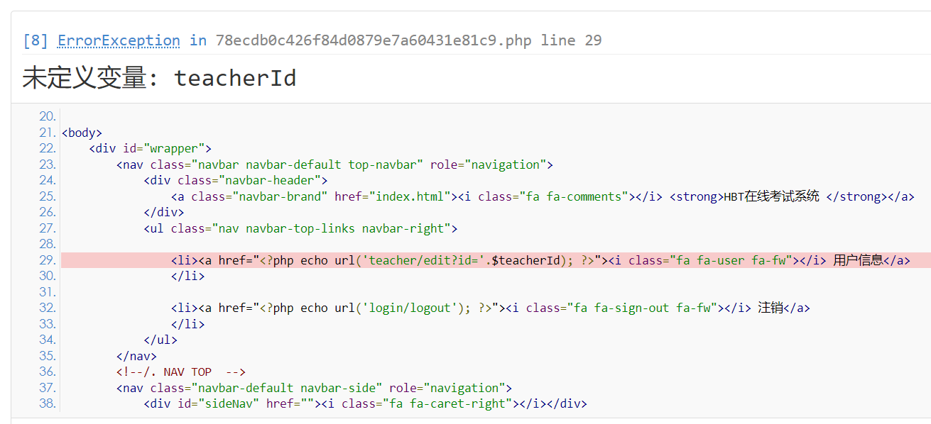 这里突然发现这并不是我以为的文件,报错的位置是另一个文件。看到这里就知道问题的原因了。因为我的菜单使用了继承,所以没有重写的位置,完全使用原来的代码,但是这个时候,这个文件的控制器并没有定义$teacherId这个变量。