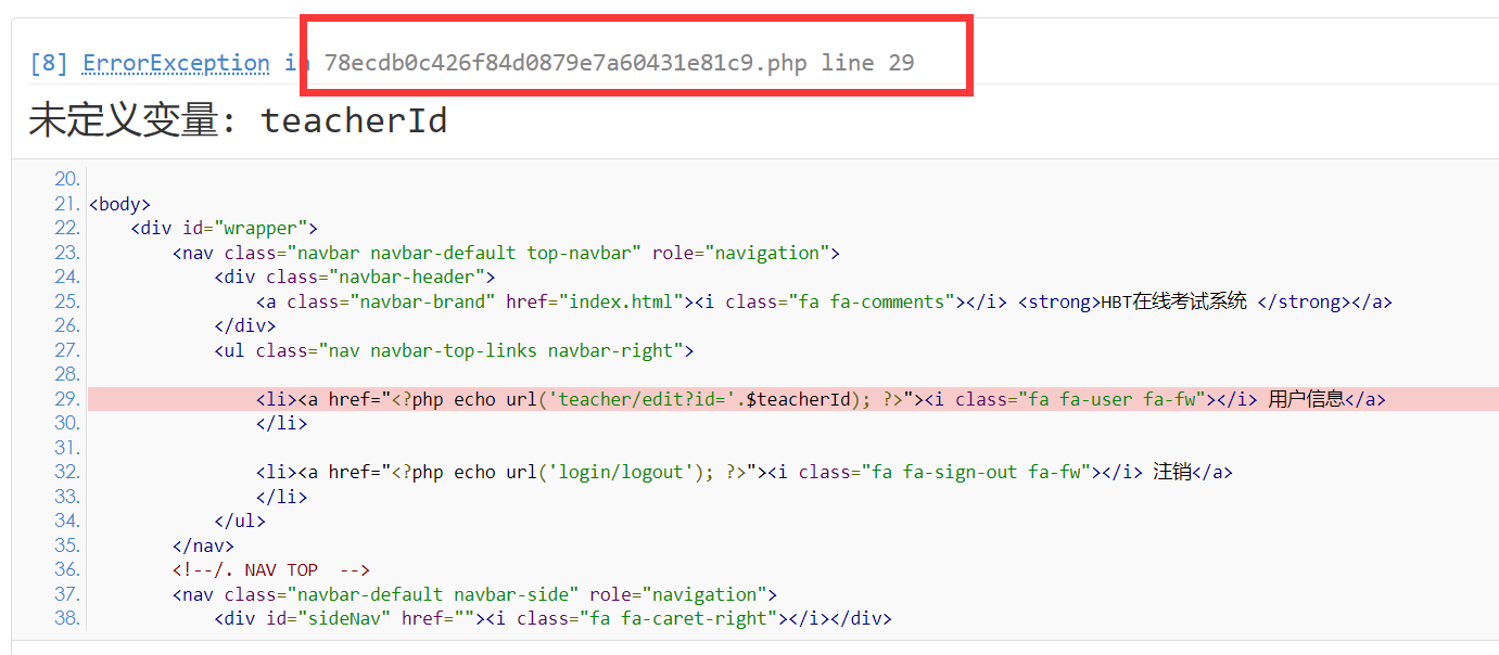 $teacherId没有定义,首先就去检查了一下我有没有拼写出错,发现没有后,检查这个变量是否传过来了,将变量换一个位置,变量存在。这时候陷入了僵局,完全不知道问题所在。又仔细看一一下报错,这时候文件名引起了我的注意,这是一个编译后的文件,将html中的tp代码都进行了转义。